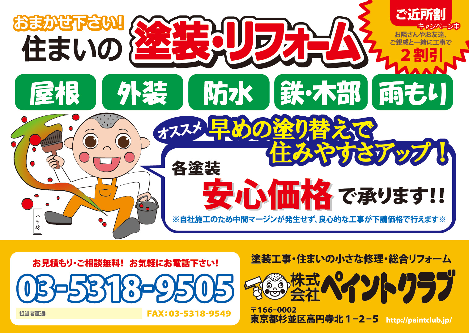 ペイントクラブは地域密着型の塗装会社です。 お客様の大切なお住まいの状況を見分調査の上、ご心配事やご要望をお伺いして現状に合った塗装工事を設計・ご提案しております。 まずはお気軽にお声かけ下さい。