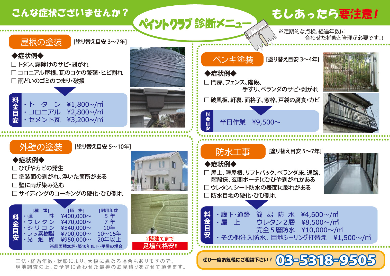 外壁塗装(塗り替え目安5〜10年) | ◇ひびやカビの発生 ◇塗装面の剥がれ,浮いた箇所がある ◇壁に雨がしみこむ ◇サイディングのコーキングの硬化/ひび割れ ≪料金目安≫(総面積20坪・築10年以下・平屋の場合) ・弾 性 ¥350.000〜 ・ウレタン ¥470.000〜 ・セラミック,シリコン ¥490.000〜 ・フッ素樹脂 ¥700.000〜 ・光 触 媒 ¥950.000〜